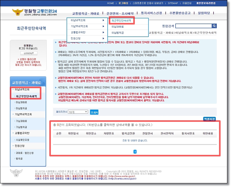홈페이지 첫 화면에서 최근무인단속내역이라는 바로가기를 클릭하면 바로 확인이 가능합니다. 메뉴에서 교통범칙금,과태료 미납내역 조회 최근무인단속내역을 선택해도 동일한 화면으로 이동합니다.