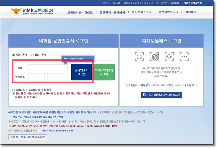 2. 속도위반 실시간 조회 : 공인인증서로 로그인 하기