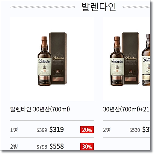 우선 롯데면세점 싸이트에서 가격을 둘러 보겠습니다. 인천공항점 주류예약 이벤트를 하고 있는데, 발렌타인 30년산 가격이 1병에 319달러, 2병에 558달러의 할인된 가격을 보이고 있습니다. 1병은 20%할인을 해주지만, 2병 구매시 30%할인을 해주네요.