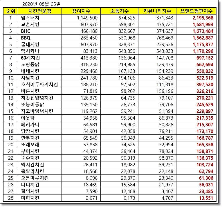 이 데이타는 2020년 7월 4일부터 2020년 8월 4일까지의 치킨 브랜드 빅데이터 약 1400만여개를 분석하여 내놓은 결과라고 하네요.