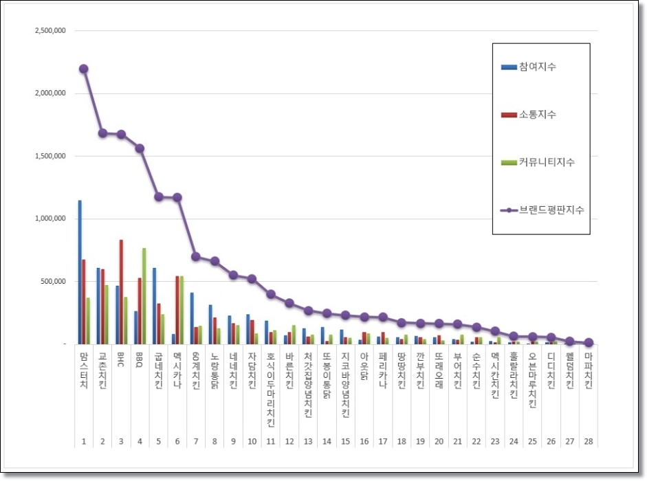 참고로 치킨 순위를 위한 브랜드 평판 순위의 기준은 참여가치, 소통가치, 소셜가치, 시장가치, 재무가치 총 5가지 라고 합니다. 평판 조사에서는 참여지수, 소통지수, 커뮤니티지수로 분석했다고 해요.