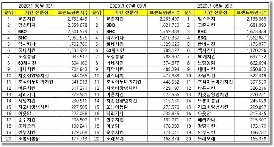 맛있는 치킨 순위 2020 - 치킨 브랜드 소비자 평판 2020년 6월~8월 비교 표